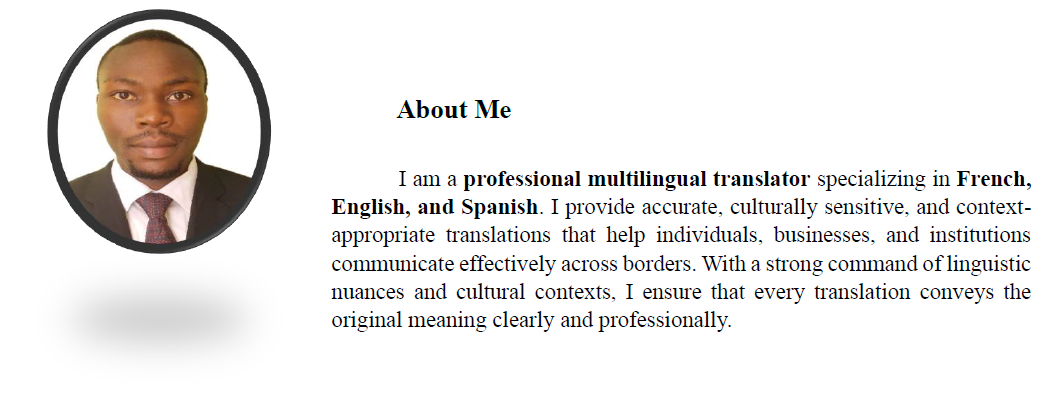 - I am a translator, language teacher, and interpreter, specializing in French, English, and Spanish. I support individuals, companies, and institutions in multilingual communication, knowledge transfer, and linguistic mediation.